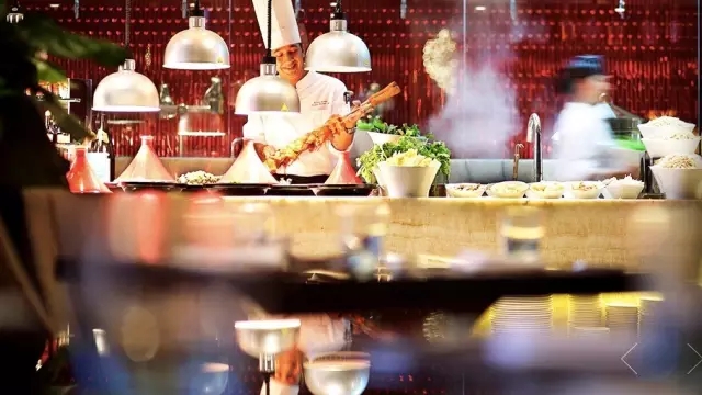 為了讓住客“早餐吃得像皇帝”,王健林特地在大堂的巨幅壁畫后藏了一間自助餐廳,4個(gè)開(kāi)放式廚房源源不斷輸出世界各地的美食,你沒(méi)吃爽,王總是不好意思讓你出門的。