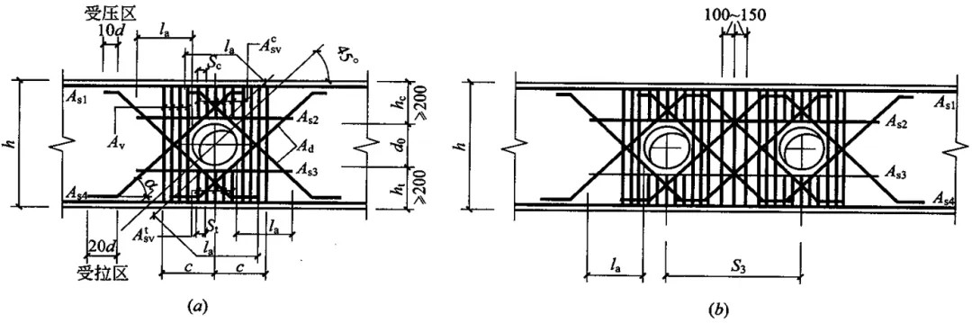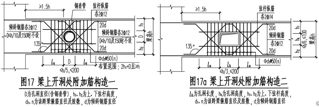 (3)當(dāng)孔洞直徑不滿足上述兩項(xiàng)要求時(shí),孔洞周邊的配筋應(yīng)按計(jì)算確定,但不得小于按構(gòu)造要求設(shè)置的鋼筋。